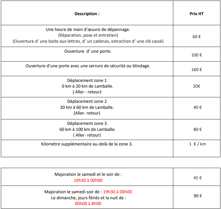 L’affichage des principaux tarifs de vente hors établissement sur le site résulte d’une obligation légale sur les métiers de dépannage et nous devons aux particuliers une information claire sur les principaux tarifs.